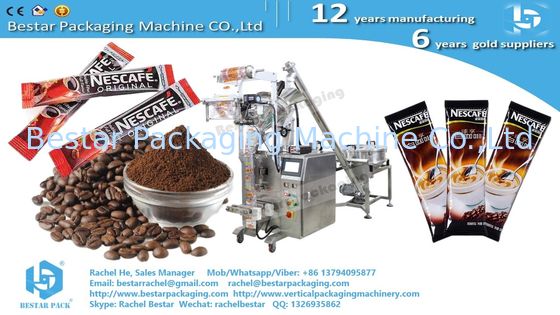 Bestar small VFFS packing machine for coffee powder 20-60g packaging, with auger screw feeding tank, auger screw measuring system, automatic filling and sealing small sachet stick packaging.