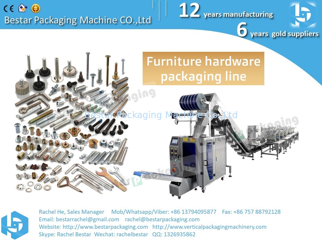 Bestar customized Multi-functional packaging machine to count and pack furniture spare parts. Machine solution is, with 18 vibrations bowls for 18 different hardware of furniture, 1 customized small weigher, 2 positions for manual feeding. Combination of counting, weighing, and manual ways for various kinds of hardware. High efficiency, multiple, flexible packaging solution!