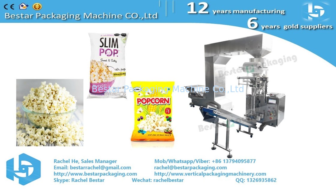 Bestar small vertical Form-Fill-Seal packaging machine, with volumetric cup device and the brush device, suitable for popcorn products packaging. Machine connecting with a Z-type elevator, which automatic feeding the popcorn into the machine hopper easily and lasting for long time no-labor operating.