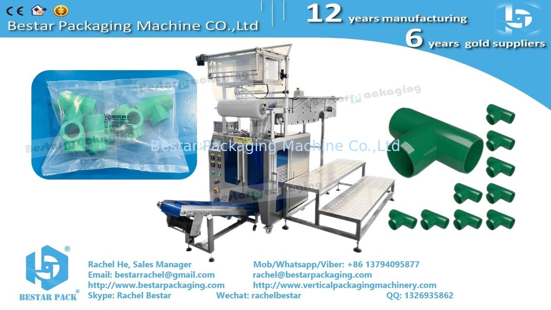 Bestar counting packaging machine, full set machine enlarged for pipe fittings, such as enlarged vibration bowl, enlarged feeding tube, enlarged machine feet, etc. Machine is strong and working stable.