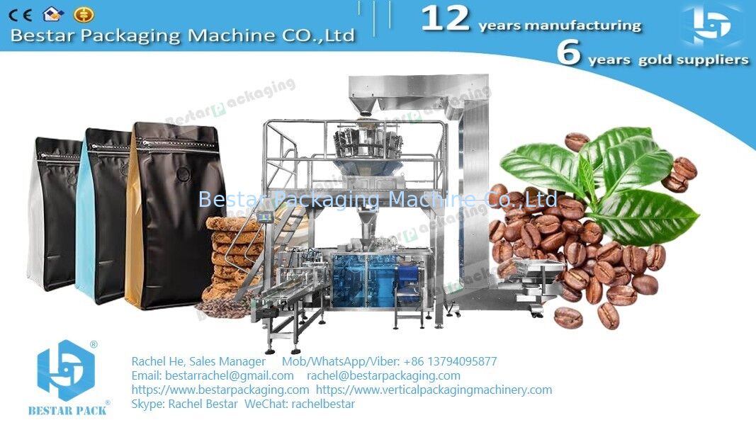 Bestar advanced packing machine features a 14-head weigher with forced discharge for efficient granular handling, innovative 5-station automatic doypack machine that adjusts width for various retail formats. Designed specifically for coffee beans, it packages products into zipper pouches with degassing valves to preserve freshness.
